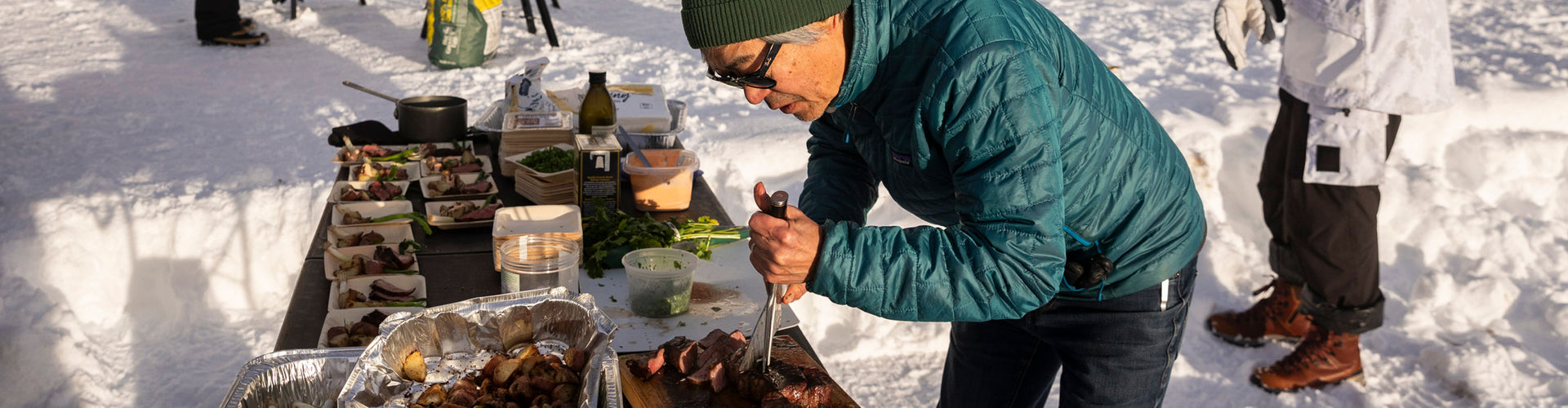 I’m working furiously to slice and plate a huge stack of SRF NY strip steaks. There’s a crew of 20 hungry skiers and snowboarders headed my way, and I can’t let them wait. They’ve been out all day on a snowcat trip, skiing and riding the backcountry surrounding Brundage Mountain near McCall, Idaho.