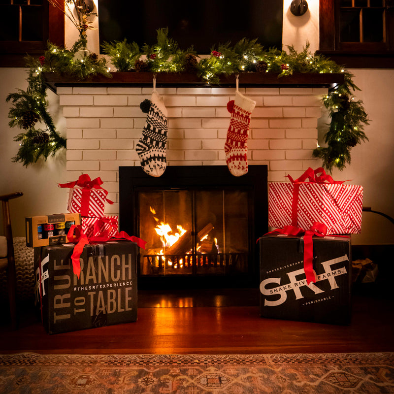 two Snake River Farms Boxes in front of a Christmas Tree