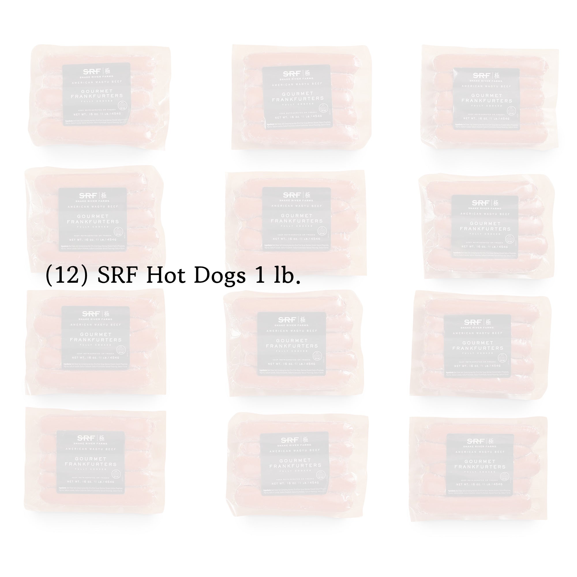 Get ready for hot dog greatness with a cache of 12, one pound packs of Snake River Farms Wagyu hot dogs. Top-rated in numerous taste tests, these are America's premier gourmet hot dog made with 100% American Wagyu beef. Crafted with our proprietary blend of spices and slowly smoked with real hardwood, these fully cooked, skin-on dogs have a firm bite that’s hard to find but is the hallmark of a truly authentic hot dog.