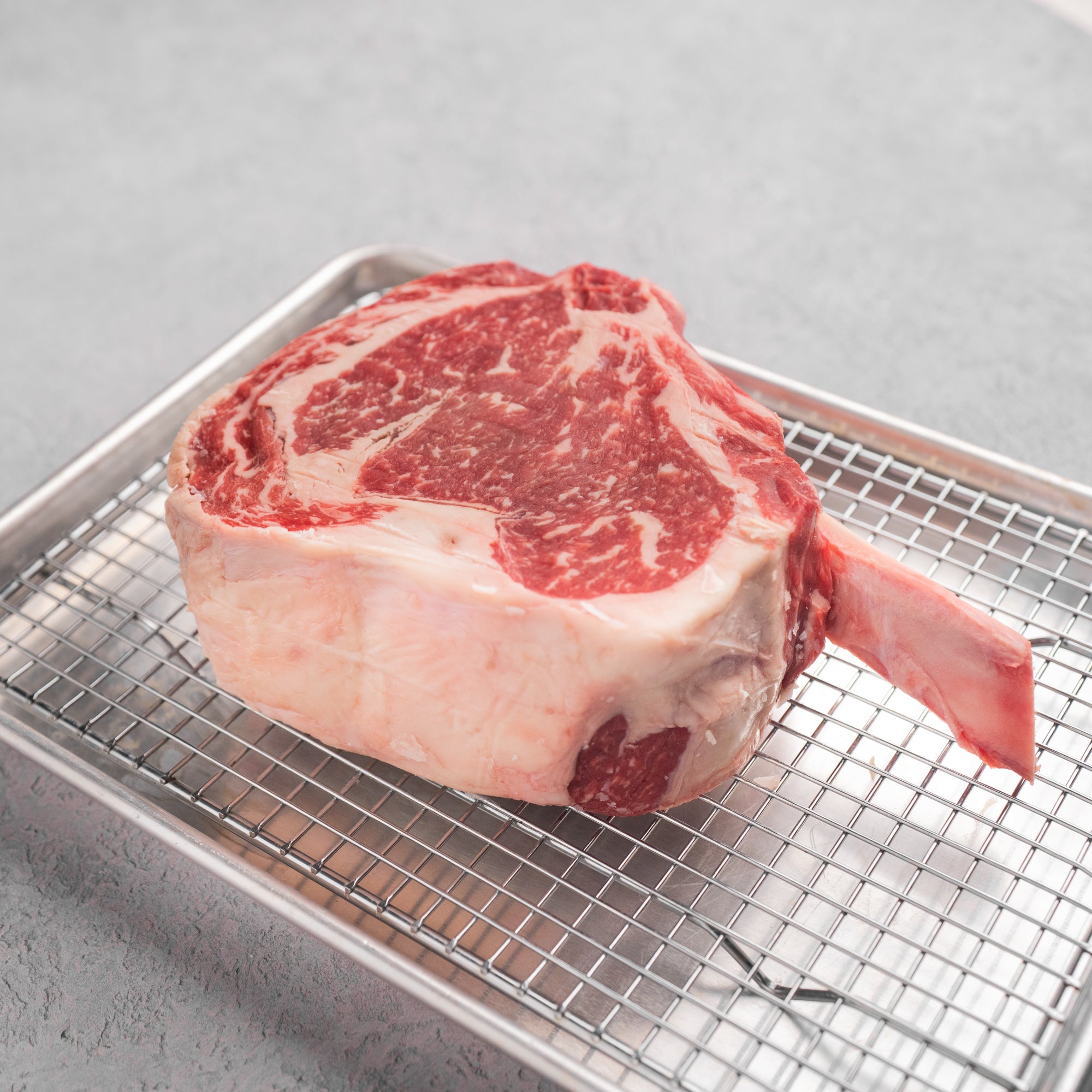 The cowboy steak contains an abundant amount of marbling, so it’s best cooked medium rare to medium to allow the intramuscular fat to liquify and distribute throughout the steak.