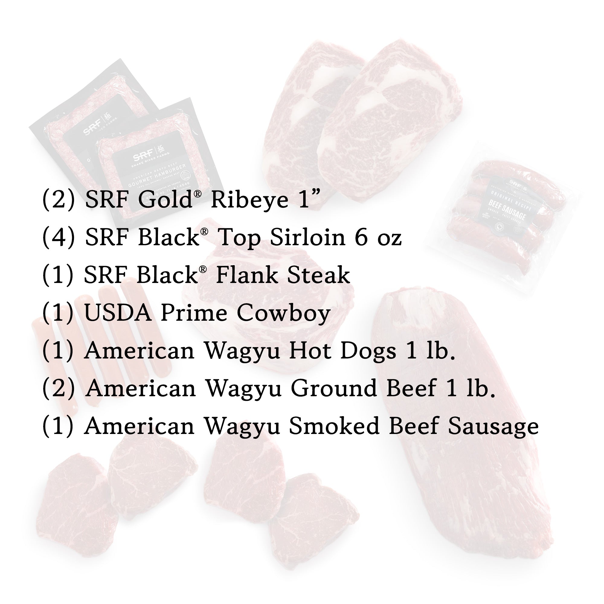 Fire up your Pit Boss and get ready for a lineup built to impress. This box features the best of Snake River Farms, from everyday favorites to show-stopping cuts. Grill up juicy American Wagyu Ground Beef burgers, savory Smoked Beef Sausage, and gourmet Hot Dogs for crowd-pleasing classics. Then take things to the next level with a bold SRF Flank Steak, two buttery SRF Gold Ribeyes, four tender Top Sirloins, and the star of any cookout—a massive USDA Prime Cowboy Steak.