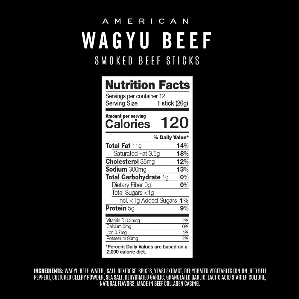Wagyu beef, water, salt, dextrose, spices, yeast extract, dehydrated vegetables (onion, red bell pepper), cultured celery powder, sea salt, dehydrated garlic, granulated garlic, lactic acid starter culture, natural flavors, made in beef collagen casing.