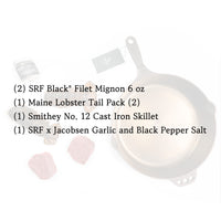 The SRF x Smithey Cast Iron Surf & Turf Collection is a specially curated package that includes world class Snake River Farms American Wagyu and wild-caught lobster tails from the coast of Maine. The extra special touch is a Smithey No. 12 cast iron skillet. Cast in a unique bronze hue that is both practical and beautiful.