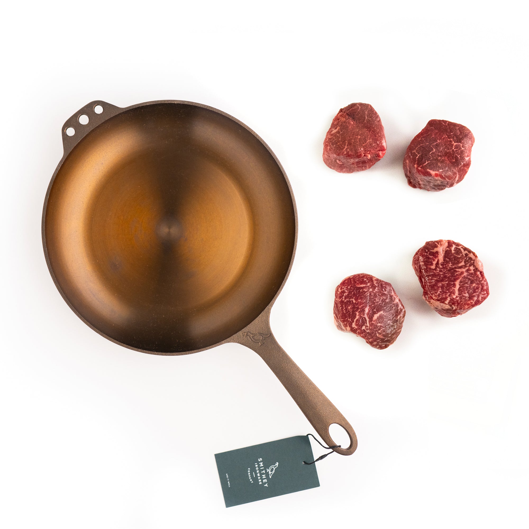 The Smithey No. 10 Cast Iron Skillet is a welcome addition to any home chef’s tool kit. With a polished interior and easy-to-hold handle, the versatile skillet sears steaks, sautés veggies and cooks perfect omelets. 4 SRF Gold® steaks are included to put the skillet to work right away.