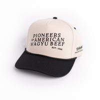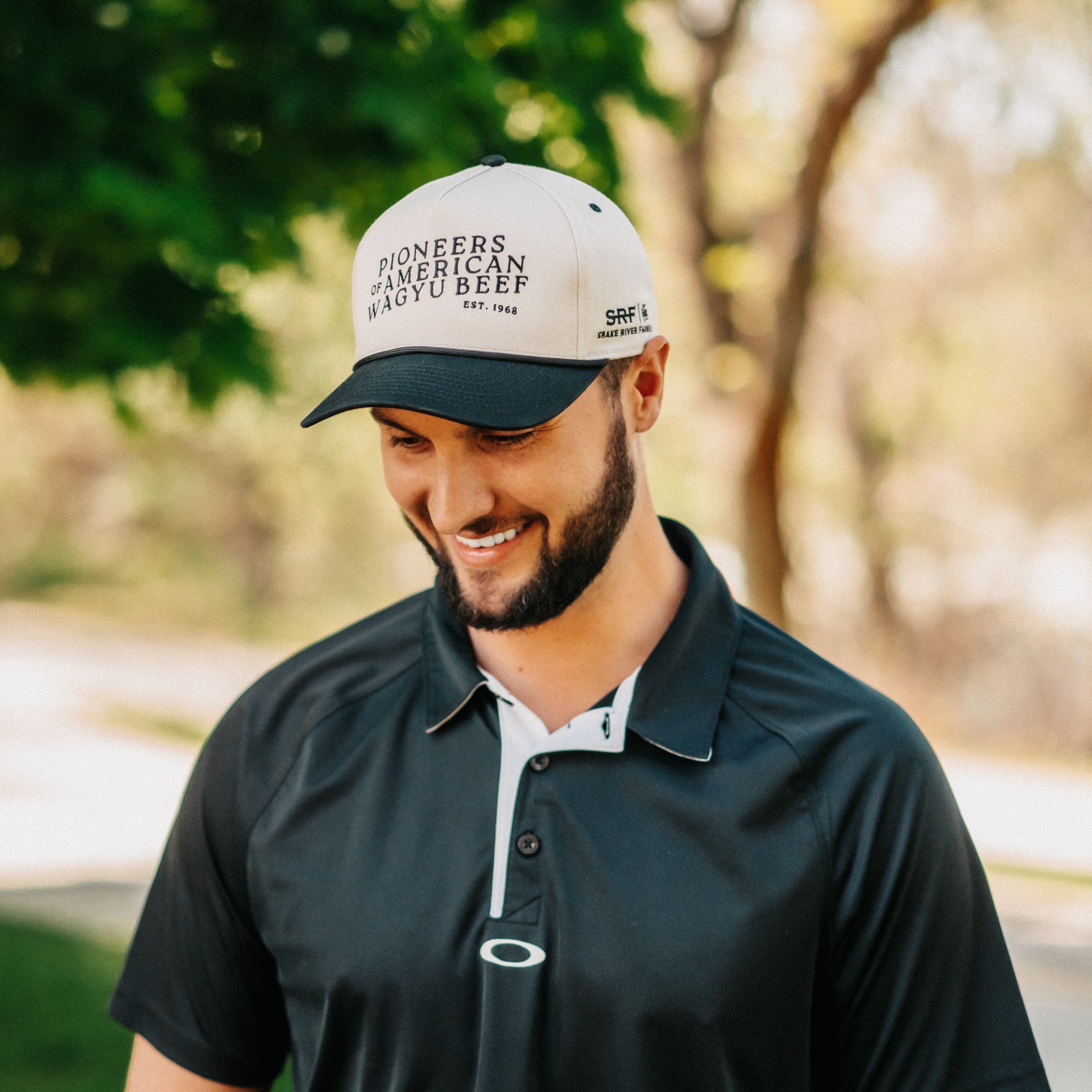 Add a new head topper to your cap collection with the SRF Pioneer Hat. The 5-panel construction holds its shape and is comfortable in all conditions. Embroidered with “Pioneers of American Wagyu Beef” on the front and the SRF logo on the side. The black artwork pops against the stone color and we added a black brim, top button and eyelet vents for tasteful accents.