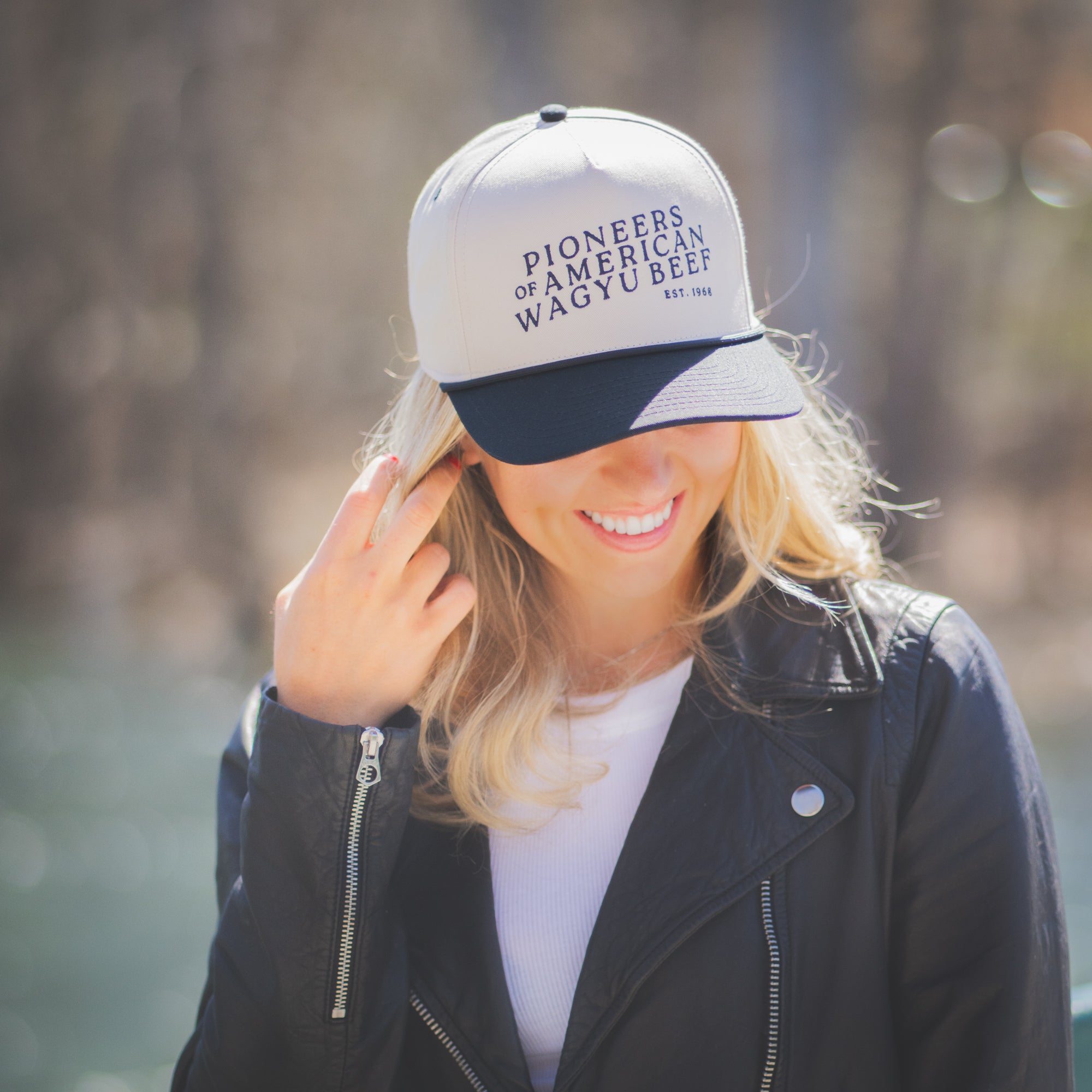 Show your pioneer spirit with this Snake River Farms hat in a neutral stone colored crown and black visor. “Pioneers of American Wagyu Beef” is embroidered on this stylish and comfortable 5-panel design.